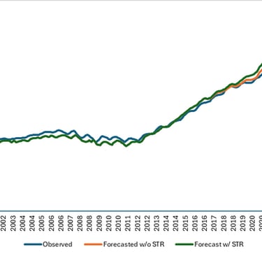 Note that these lines are indistinguishable until the mid 2010s, when the first STR licenses were issued. Although not exactly matching, the two models follow roughly the same trajectory until about 2021. The number of STR licenses is estimated to have risen from just above 300 licenses in 2019 to over 1,000 in 2022, and close to 2,500 in 2025. Starting in 2022, these two models diverge significantly. The model that includes typical indicators of home prices, like interest rates and employment, ceases to be enough to replicate observed home price increases, where it was highly effective in years previous. The addition of the STRs as a variable brings the model back into alignment with observed experience.